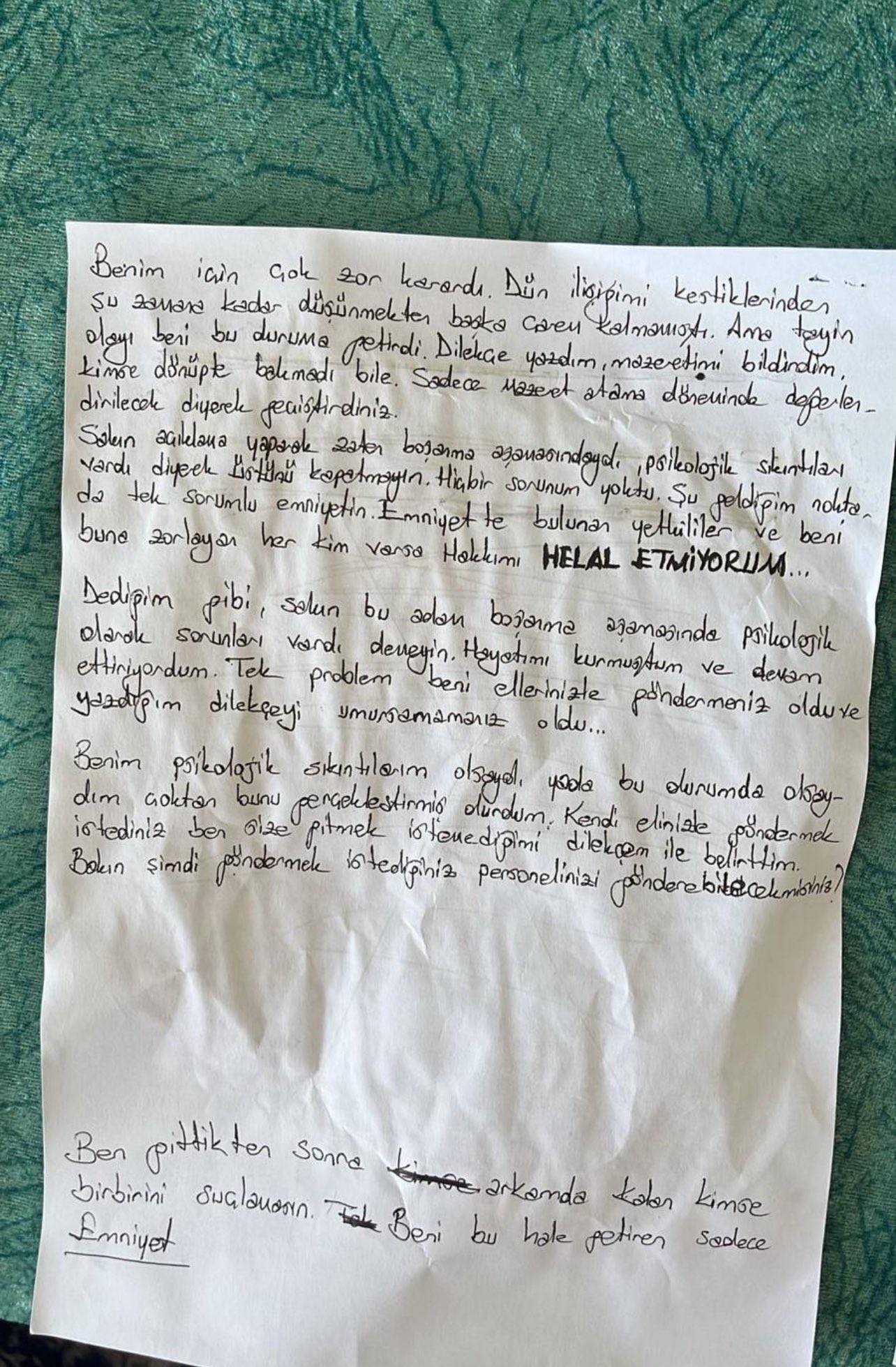 Mektubunun başında çocuklarına seslenen Selçuk, şunları söyledi, “Ben gittikten sonra arkamda kalan kimse birbirini suçlamasın. Beni bu hale getiren sadece emniyet.  “Canım oğlum, prenses kızım… Sizi canımdan çok seviyorum. Benim dünyadaki tek varlıklarım sizdiniz. Bu yaşıma kadar yaşadığım en güzel, en özel anlar sizlerle oldu. Babanız hiçbir zaman güçsüz değildi. Benim gücüm hep siz oldunuz.”  “Dilekçe yazdım, mazeretimi bildirdim. Kimse dönüp bakmadı bile. Sadece ‘mazeret atama döneminde değerlendirilecek’ diyerek geçiştirdiniz. Emniyette bulunan yetkililer ve beni buna zorlayan her kim varsa, hakkımı helal etmiyorum.”